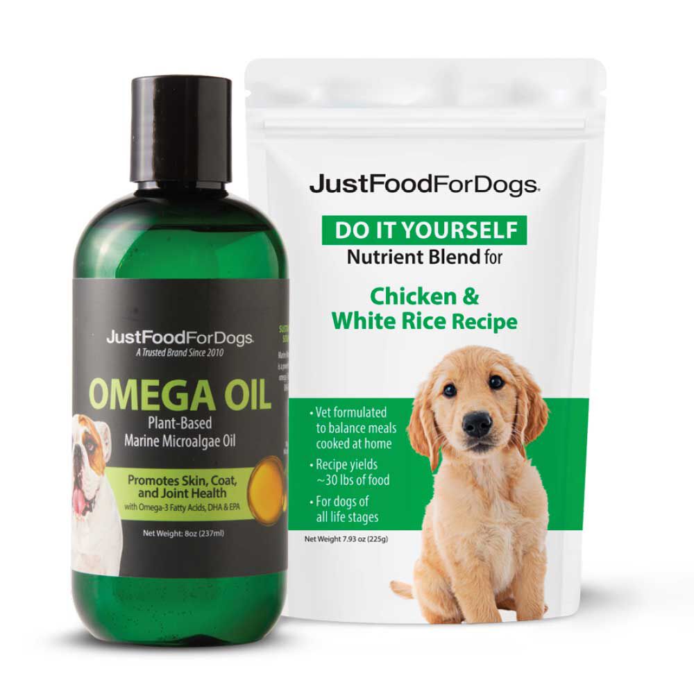 This bundle includes our Do It Yourself Nutrient Blend - Chicken, an 8 oz bottle of Omega Algae Oil, and DIY Cooking Guide with recipe and instructions.