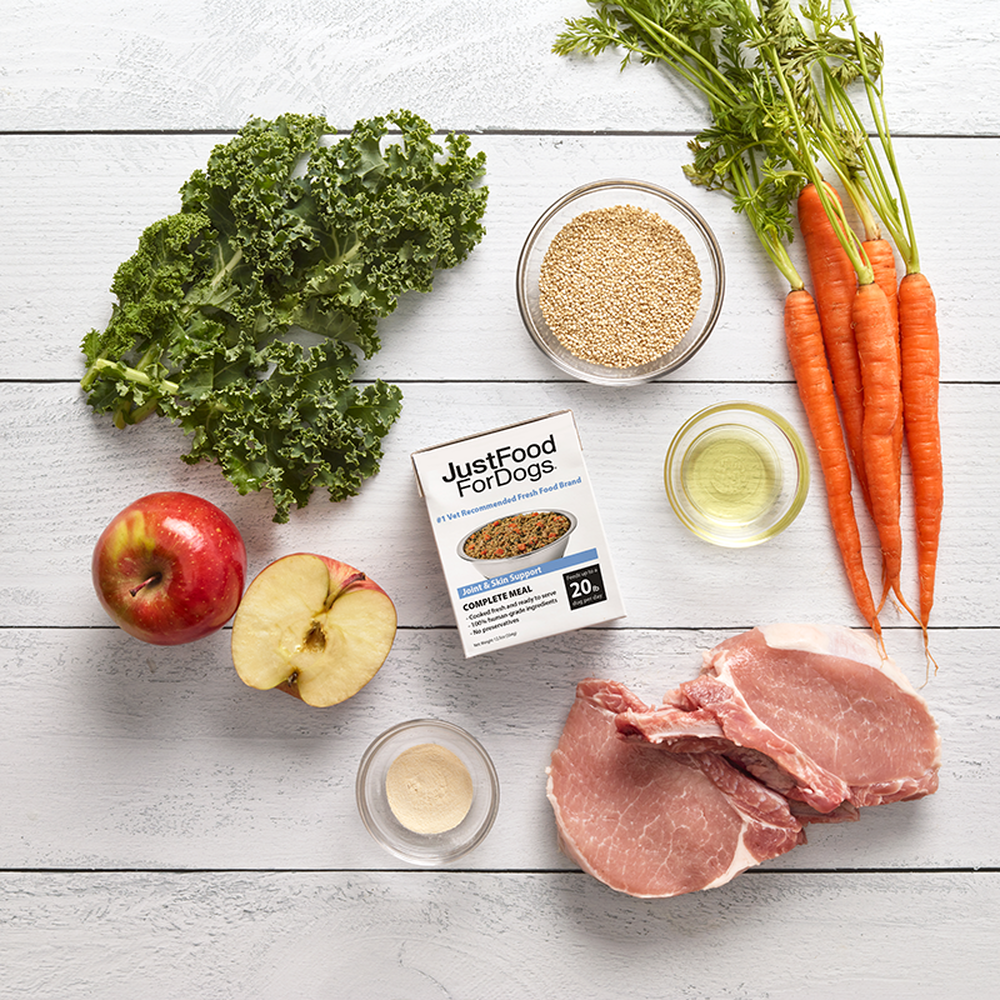 Our Pantry Fresh Joint & Skin Support diet is formulated to help support healthy skin and coat. We prepare this diet using pork loin and tenderloin, quinoa, kale, carrots, and Fuji apples. It also contains Type II Collagen to support healthy joints.