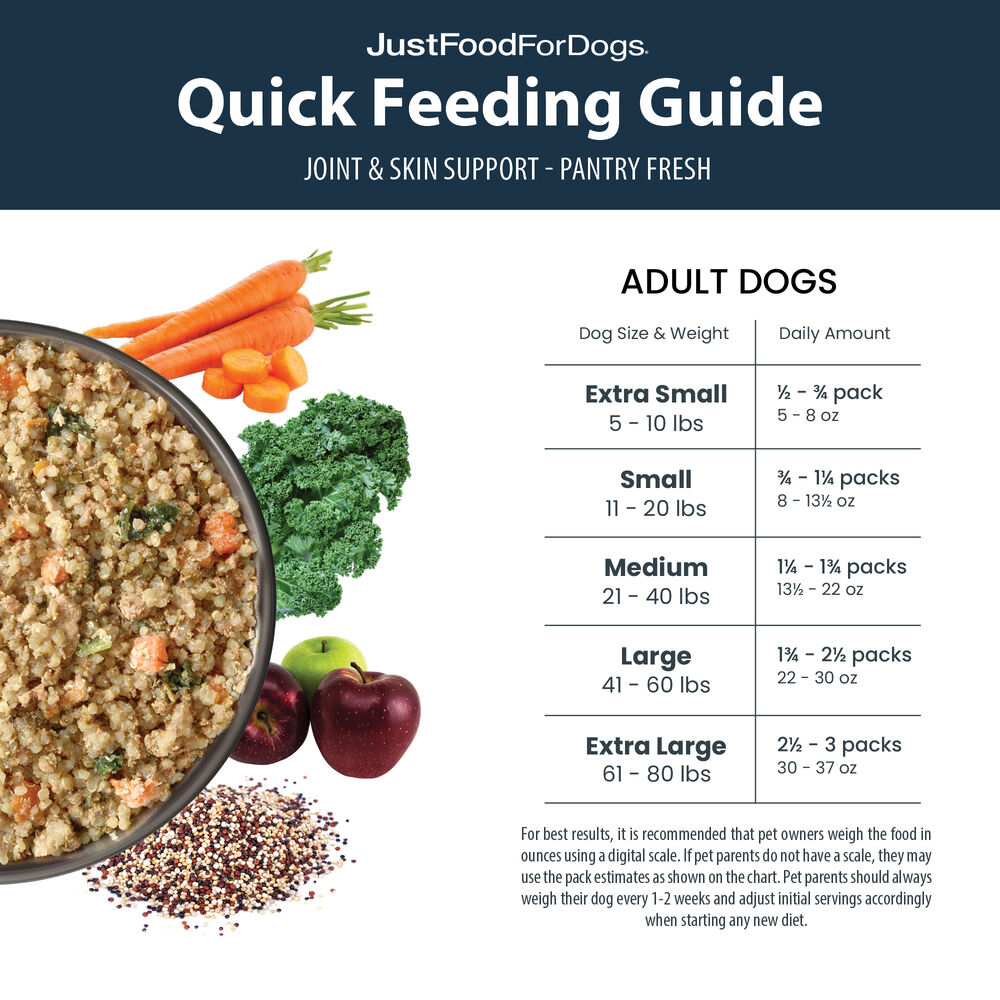 JustFoodForDogs Pantry Fresh Joint & Skin Support is formulated to meet the nutritional levels established by the AAFCO Dog Food Nutrient Profiles for maintenance.